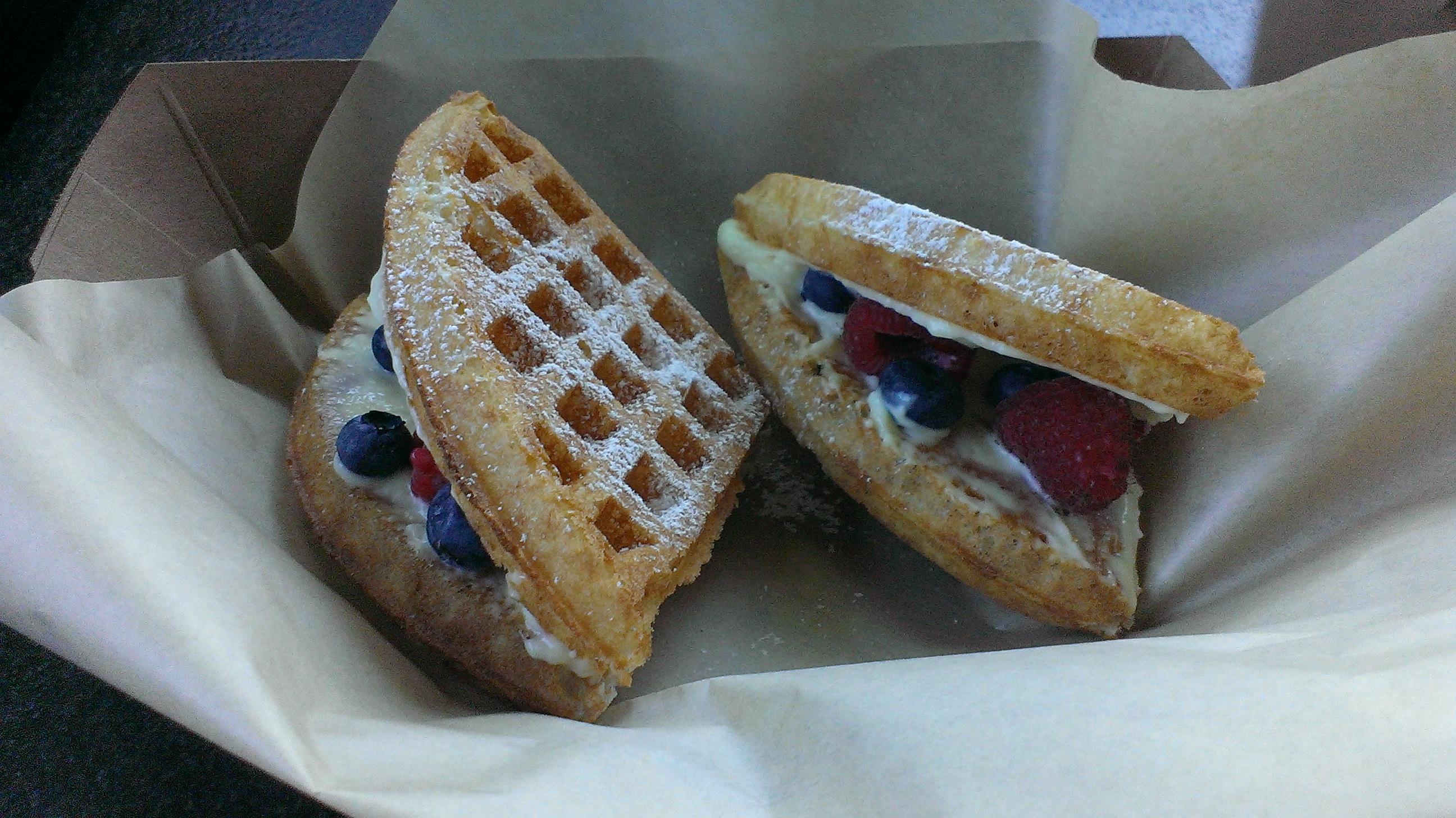 My thinking was I’d order something savory and substantial for my meal and then choose the sweets I wanted. I wasn’t trying to do sugar on top of sugar on top of sugar. I got the Protein Scramble (Scrambled egg whites, roasted chicken, cremini mushrooms, asparagus, arugula, chives and parmesan) with a side of potatoes and wheat toast. I won’t say my socks were blown off by this admittedly pedestrian choice but it was well made with a great flavor to the mushrooms and good cuts of asparagus throughout. I don’t normally put jam on my toast but the mixed berry jam they served alongside it was super tasty. Shannan ordered the same breakfast and also praised how well the dish was made and the jam, which wasn’t quite as magical on their gluten free bread, but was still a highlight.