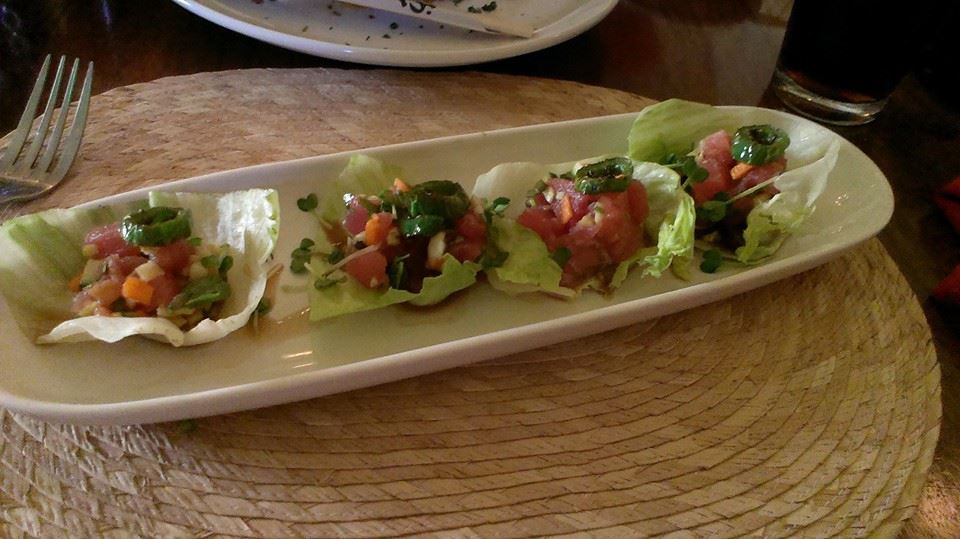 In place of rolls, The Cosmopolitan provides “Cheese Puffs” with fig butter. They were light and warm. A great mix of salty and sweet. For appetizers, Aimee ordered the Kung Pao Calamari, which she really enjoyed. Great sauce and most of all, they fry up and serve the entire squid bodies, which is unusual. Amy had the Rustico bruschetta, with herbed goat cheese and chimmichurri sauce. This sauce was the highlight of the whole dish for Amy. Abby had the Braised Pork Cheeks. With caramelized onions, crispy onions and a merlot reduction. She enjoyed the almost beef wellington-ish style of the cooking. For my appetizer, I ordered the Ahi Lettuce Cups with ginger, julienne vegetables, garlic in baby iceberg lettuce cups. I found it refreshing and zesty but nothing Earth shattering. The jalapenos on top were a bit much.