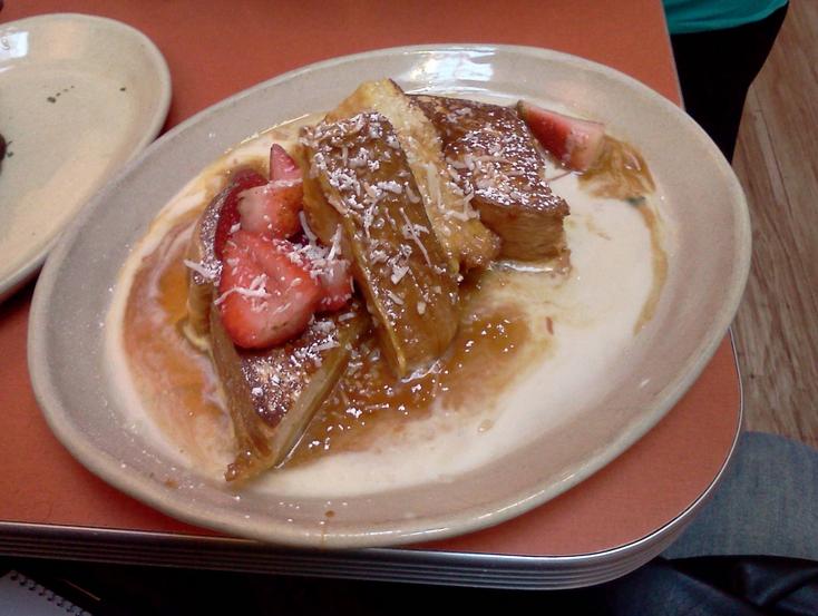 Aimee and Abby went balls out on their first plate and ordered bone marrow. While I understand it’s considered a delicacy, it’s just not my type of hype. Label me unadventurous if you must, but when you start your own blog feel free to suck the bones of whatever carcass you’d like. To ensure this dish was 100% Anthony-proof, they added a fried egg on top. If the whole thing had just then been slathered in re-fried beans, it would have been the embodiment of my personal hell. That having been said, the girls were crazy about this dish. Aimee said it was perfect with a beautiful presentation and the accompanying saffron sauce was to die for.
